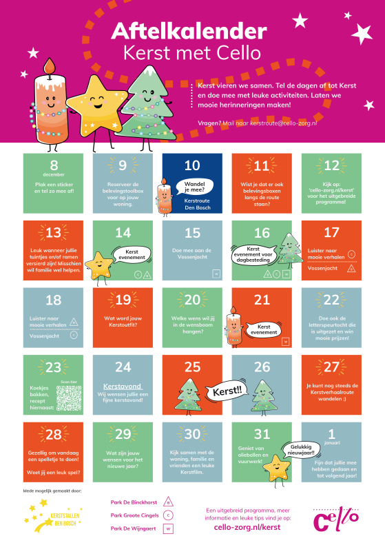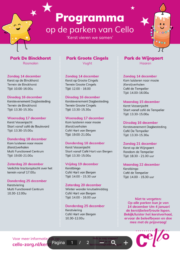 Maar dat is niet alles! Ook op de parken van Cello gaan we Kerst op een bijzondere manier beleven. Samen met cliënten, dierbaren, vrijwilligers en medewerkers geven we deze dagen vorm, zodat iedereen Kerst op zijn eigen manier kan ervaren.