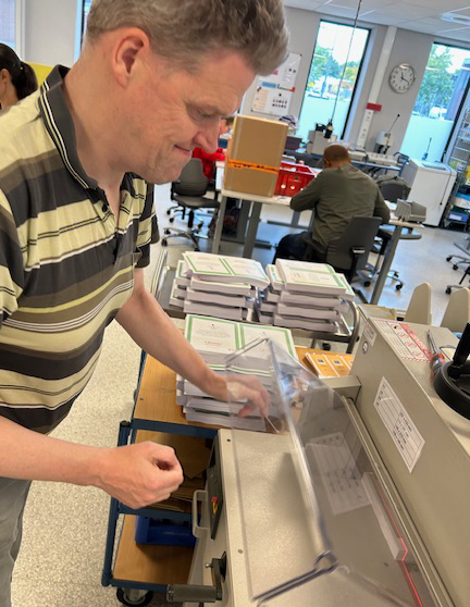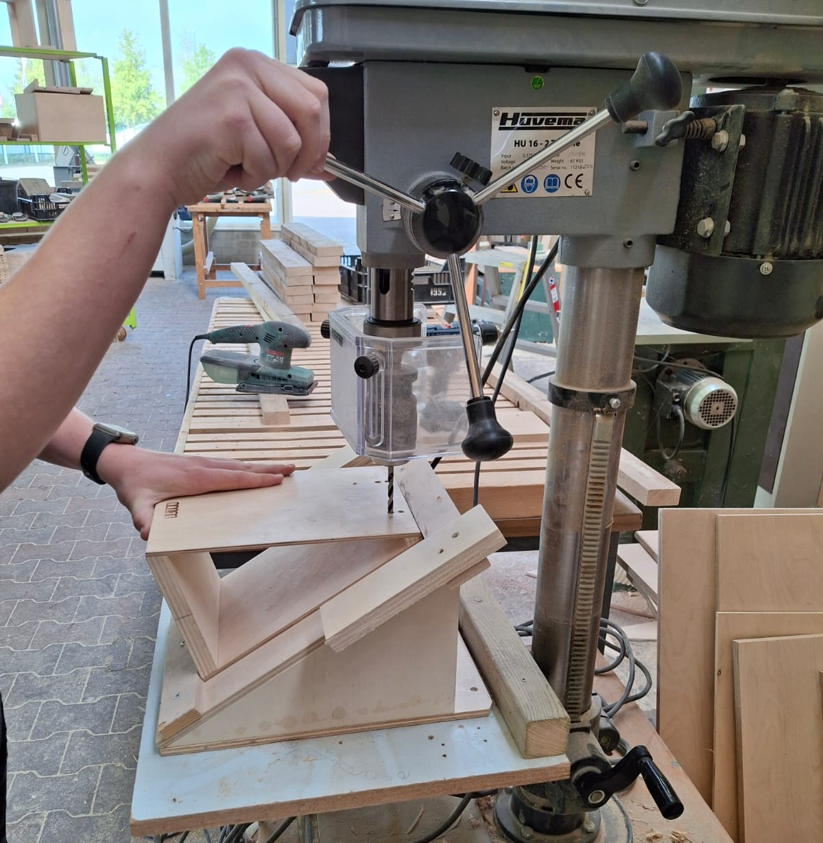 Na het vormgeven én het vullen van de kalender, was het tijd voor de productie. De Printservice van Cello nam de drukwerk-uitdaging aan. Onder leiding van coördinerend begeleider Jos werden alle wensen tot leven gebracht in een mooi product. Zo zie je op de foto dat Twan met de stapelsnijder de kalenders aan het schoonsnijden is. Na een aantal proefdrukken en aanpassingen was iedereen ontzettend tevreden! Maar de kalender had nog een essentieel onderdeel nodig: een stevige standaard.